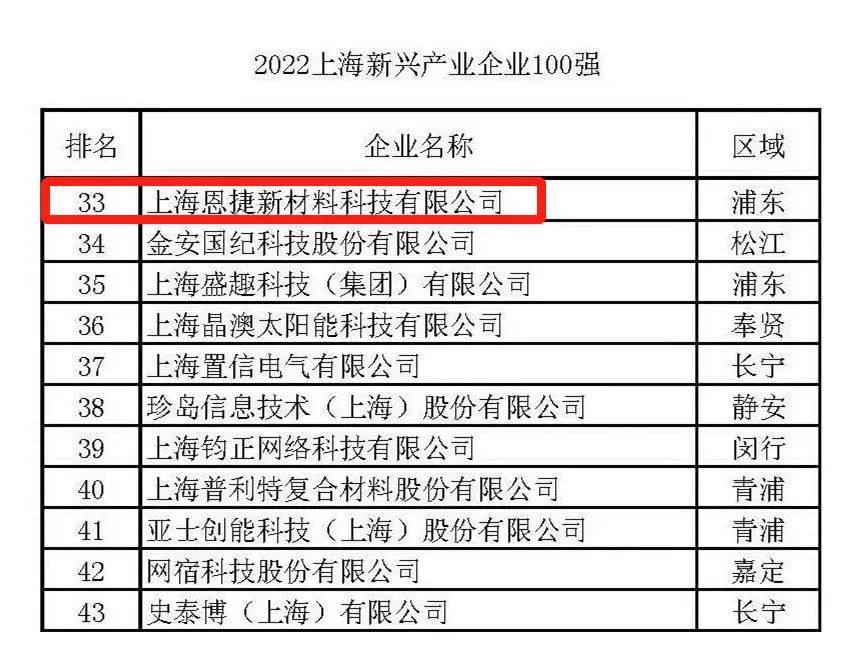 2022上海新兴工业企业100强第33名