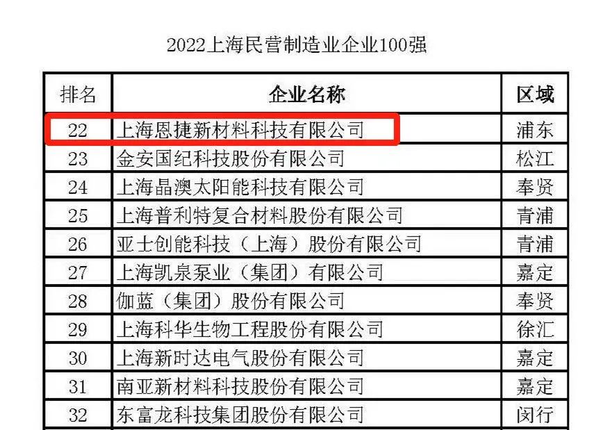 2022上海民营制造业企业100强第22名